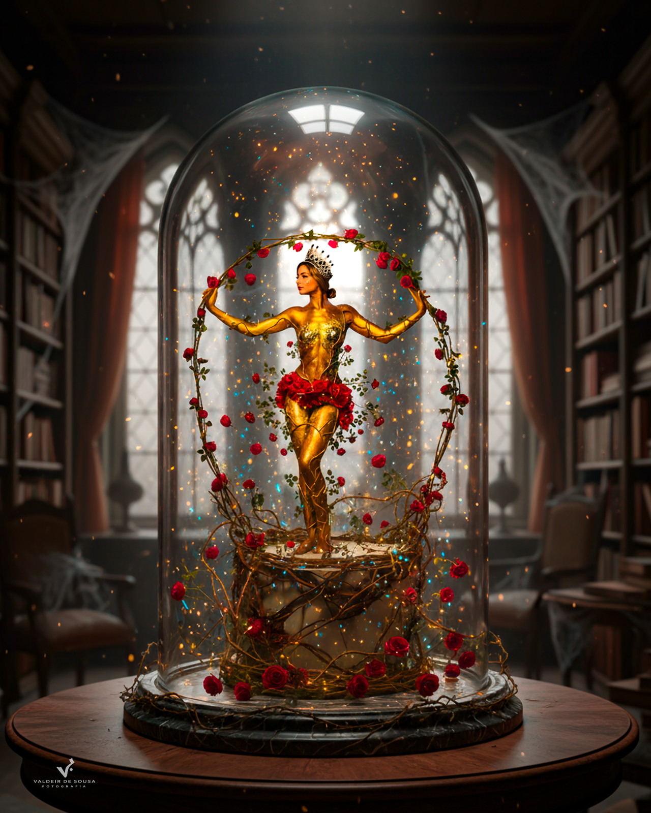 Durante a sessão, Duda comentou que, ao se ver cercada pelas flores, se sentia como “a Bela, da Bela e a Fera”. A frase despertou a imaginação do fotógrafo, que transformou o momento em uma versão híbrida intitulada “A Bela Dourada”, unindo fotografia real e arte digital.