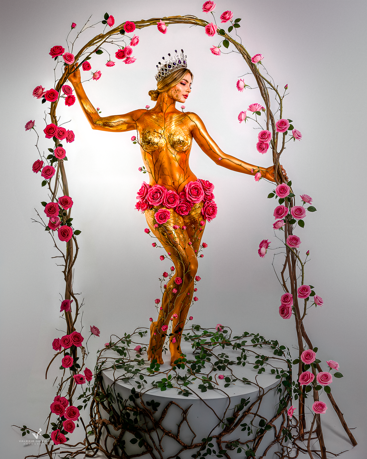 Em Ouro Vivo, o corpo da modelo é coberto por camadas de tinta dourada e detalhes metálicos, em uma composição que evoca poder e transcendência.