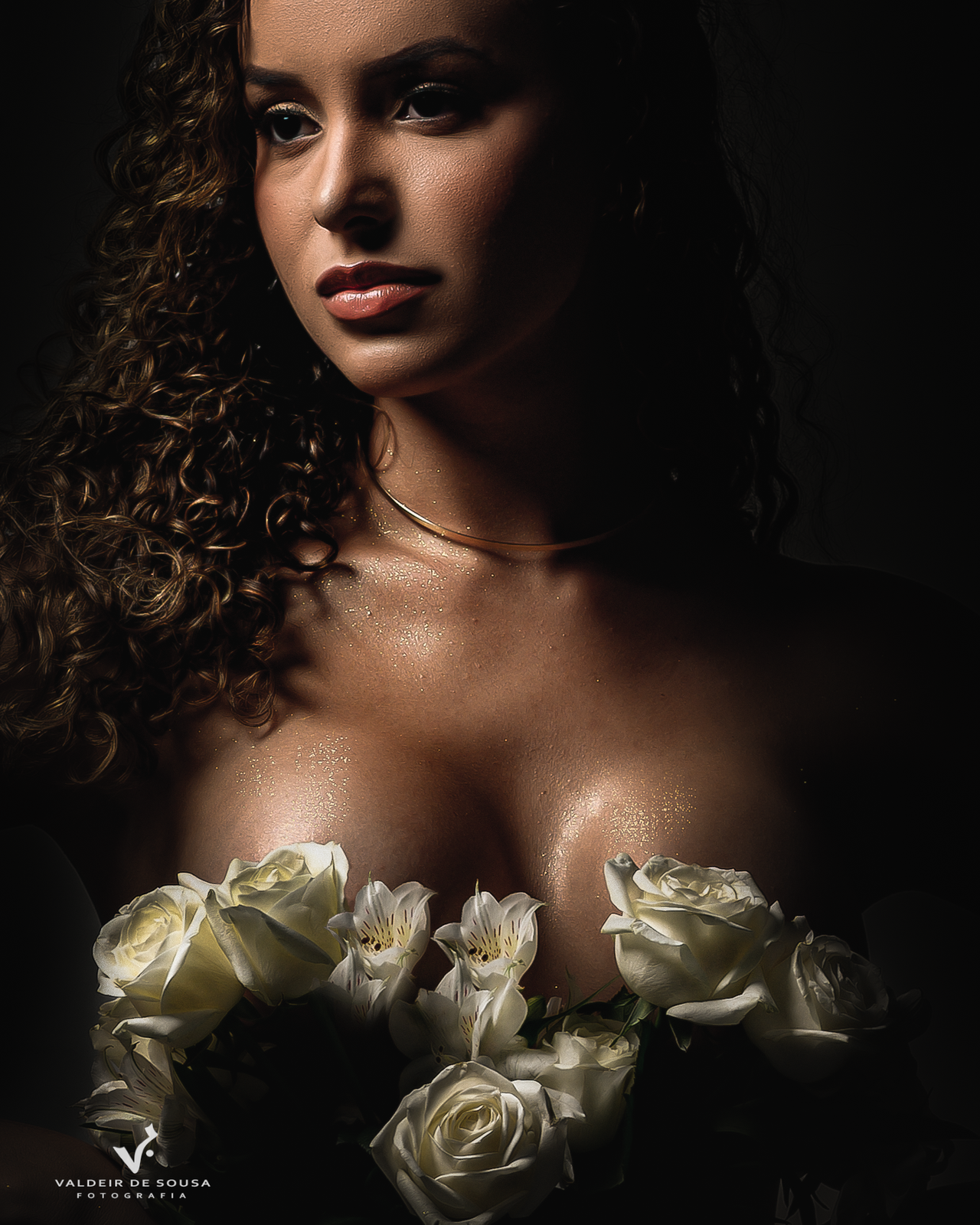 Além da luz, os tons dourados da pele e o branco delicado das flores criam um equilíbrio visual harmonioso. Essa paleta suave remete às pinturas de mestres como Leonardo da Vinci, onde as transições entre luz e sombra são feitas com fluidez, sem contornos rígidos. O resultado? Um retrato que transmite emoção, elegância e singularidade.